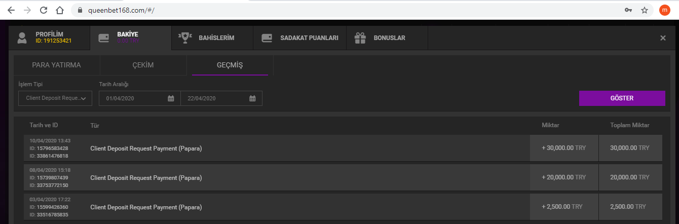 Şubat ayında üyesi olduğum bu siteye toplamda 342,280.00 TL para yatırdım ve ortalama 200.000.00 TL çekmedim bile. Bu sitedeki yetkili olduğun söylediği Emre adındaki şahıs ve Müşteri temsilcisi Selin olarak bildiğim şahıslar bu yatırımları sağlamam için bana her türlü iyimser yaklaşımı sergilediler. Ortalama net zararım 150.000.00 TL'den fazladır. Son yatırımım olan 30.000.00 TL ortalama 180.00.00 TL kazandım, fakat ben bu kazancı kazanana kadar bana iyi olan Queenbet bu kazançtan sonra bana yüzünü çevirdi ve günlük maksimum 10.000.00 TL çekimimiz var ve tek yatırımdan maksimum 10 kere çekim yapabilirsiniz gibi saçma ve düzmece bir kuralla bana yaklaşıp kazancımı kısmen ödeyip, geri kalan 64.000.00 TL'lik kazancımı haksız yere silmiştir.